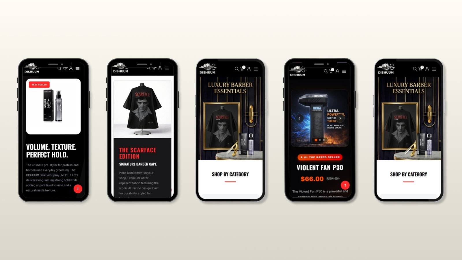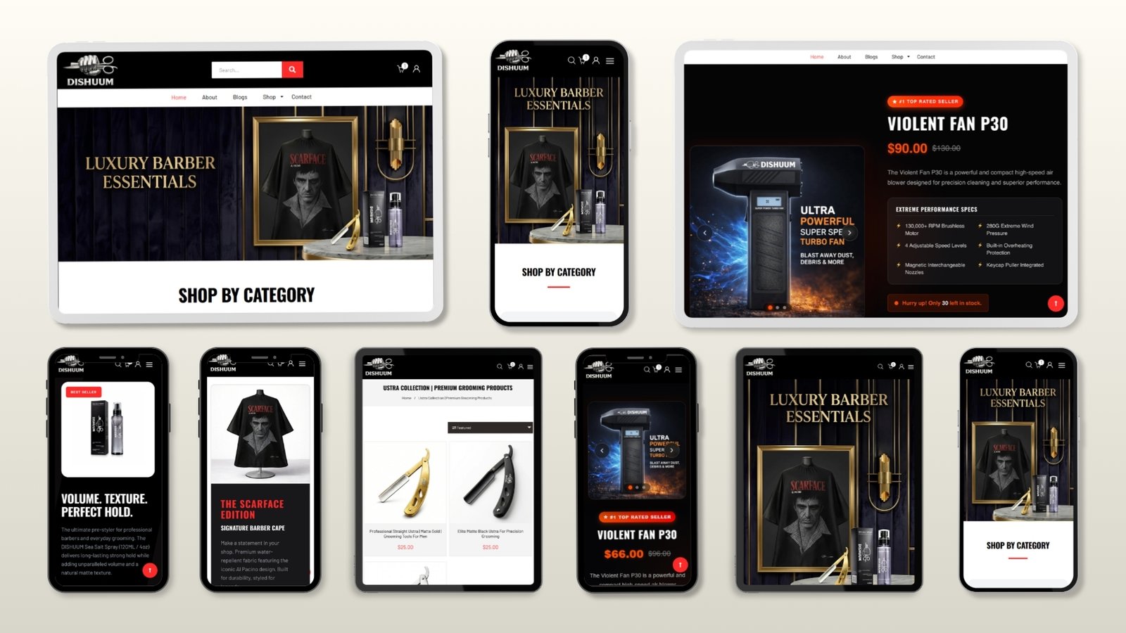 Another significant hurdle was striking the right visual balance for a dual audience: professional barbershop owners and everyday grooming enthusiasts. The platform needed to feel authentic to the edgy, modern barbering culture while maintaining a premium, trustworthy aesthetic for products like their signature sea salt sprays and precision ustras. We addressed this by employing a bold, high-contrast UI paired with high-definition tool showcases, ensuring that the precision and quality of the grooming hardware were front and center across all devices.